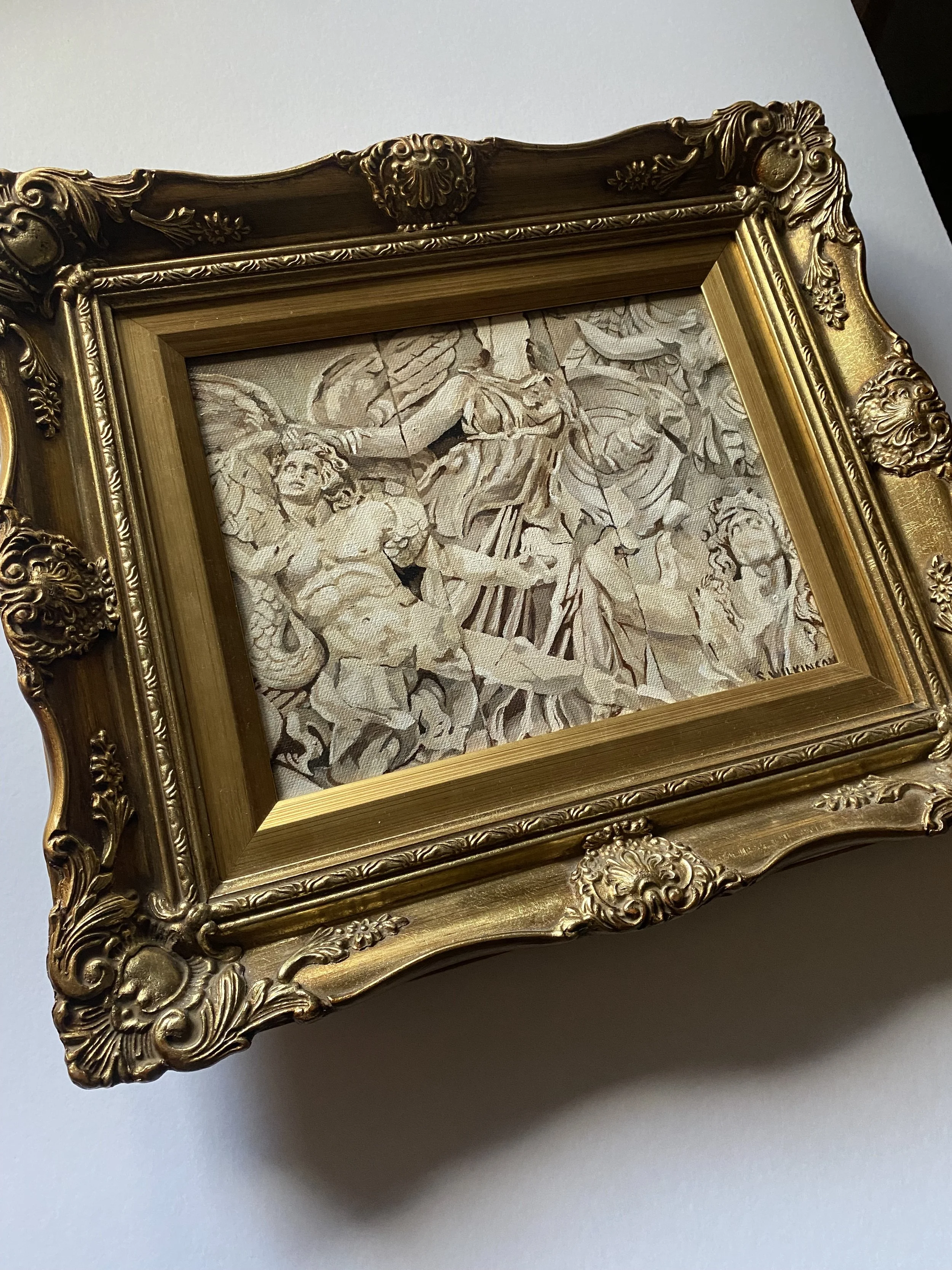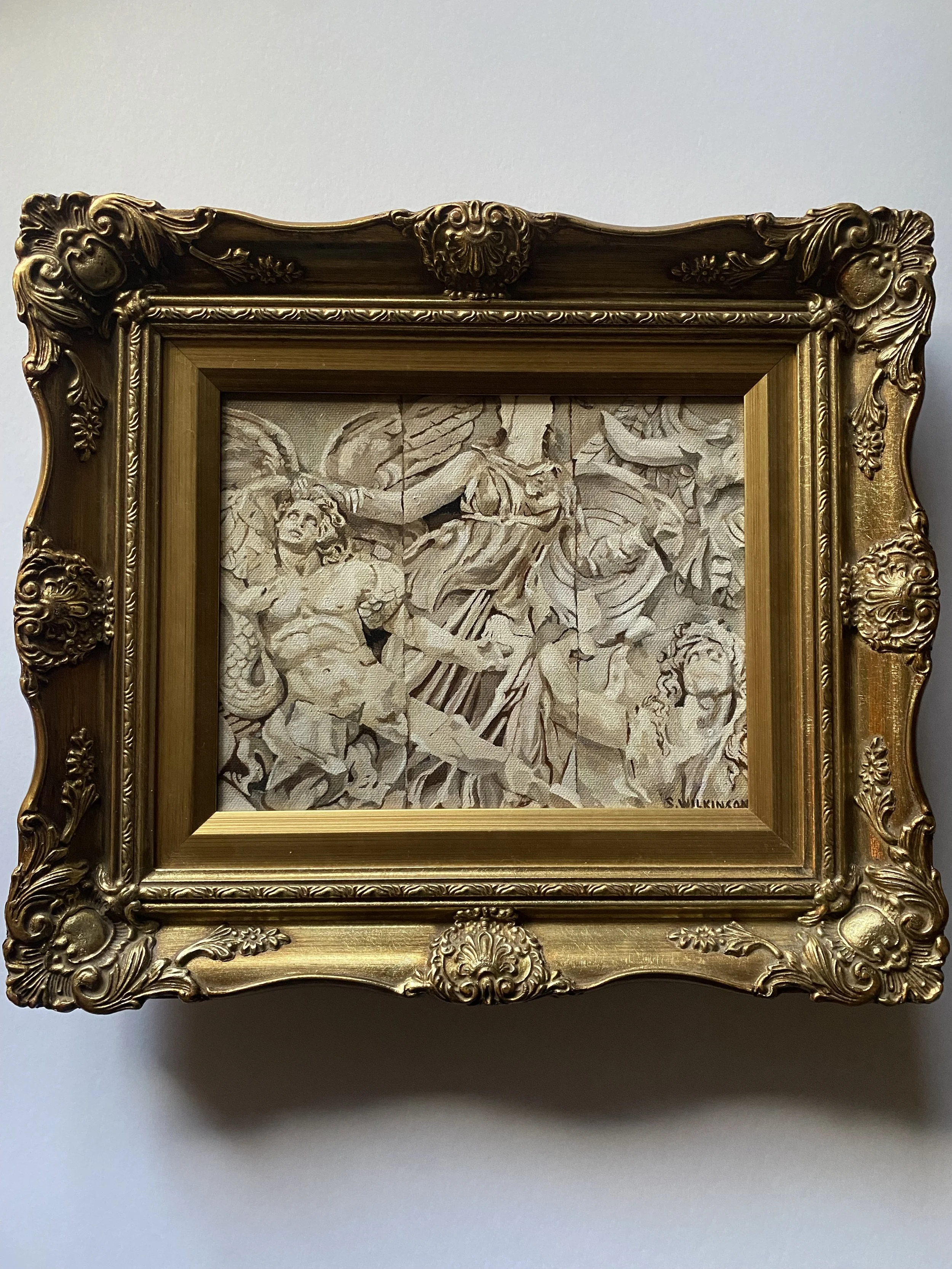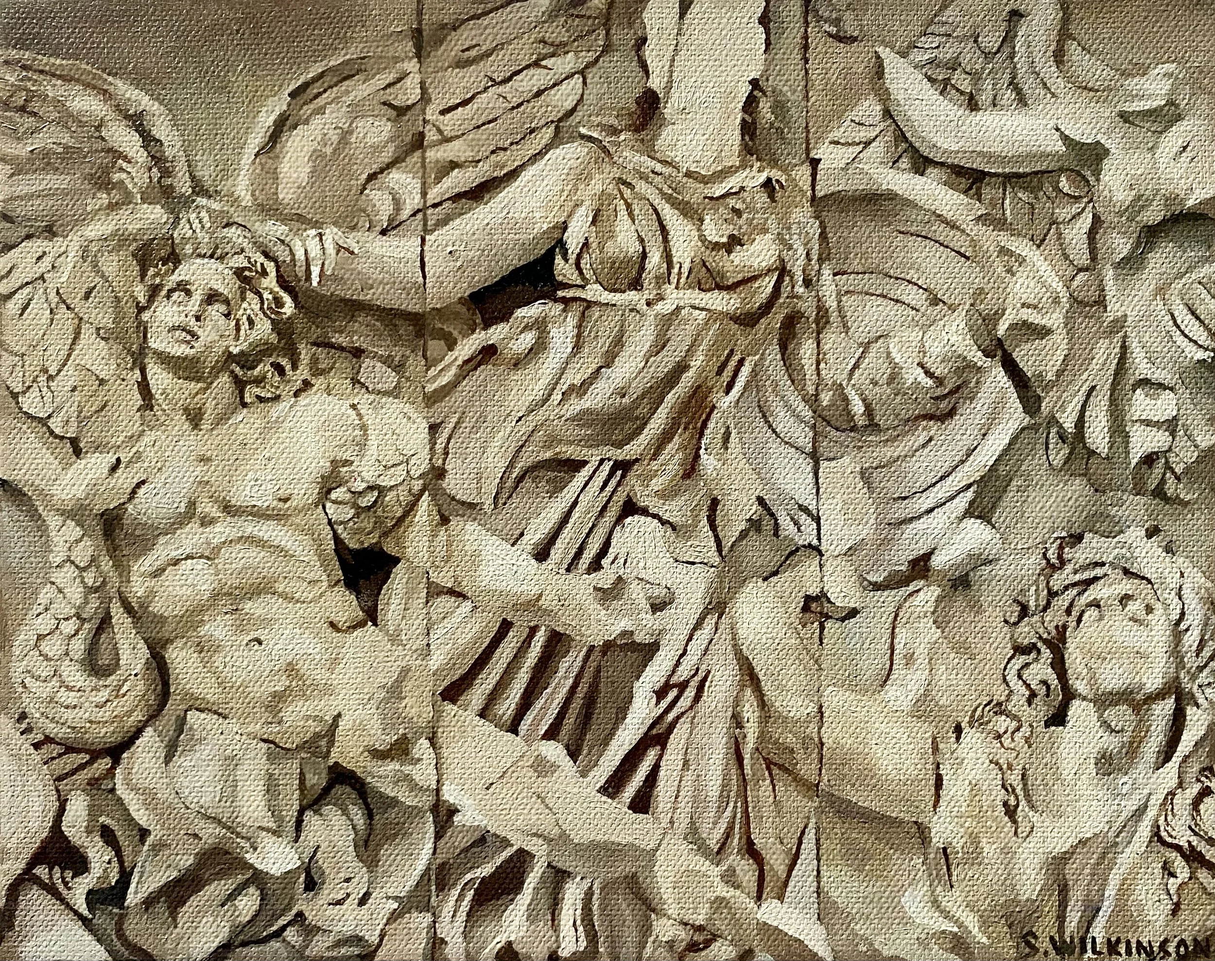 This painting is of the Gigantomachy frieze for the Pergamon Alter, which depicts the battle between gods and Titans. In this section, Athena and Nike fight Alkyoneus. This Hellenistic structure was originally built c. 200-150 BCE in Asia Minor.